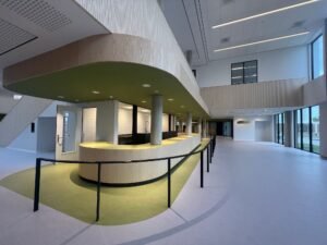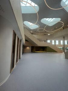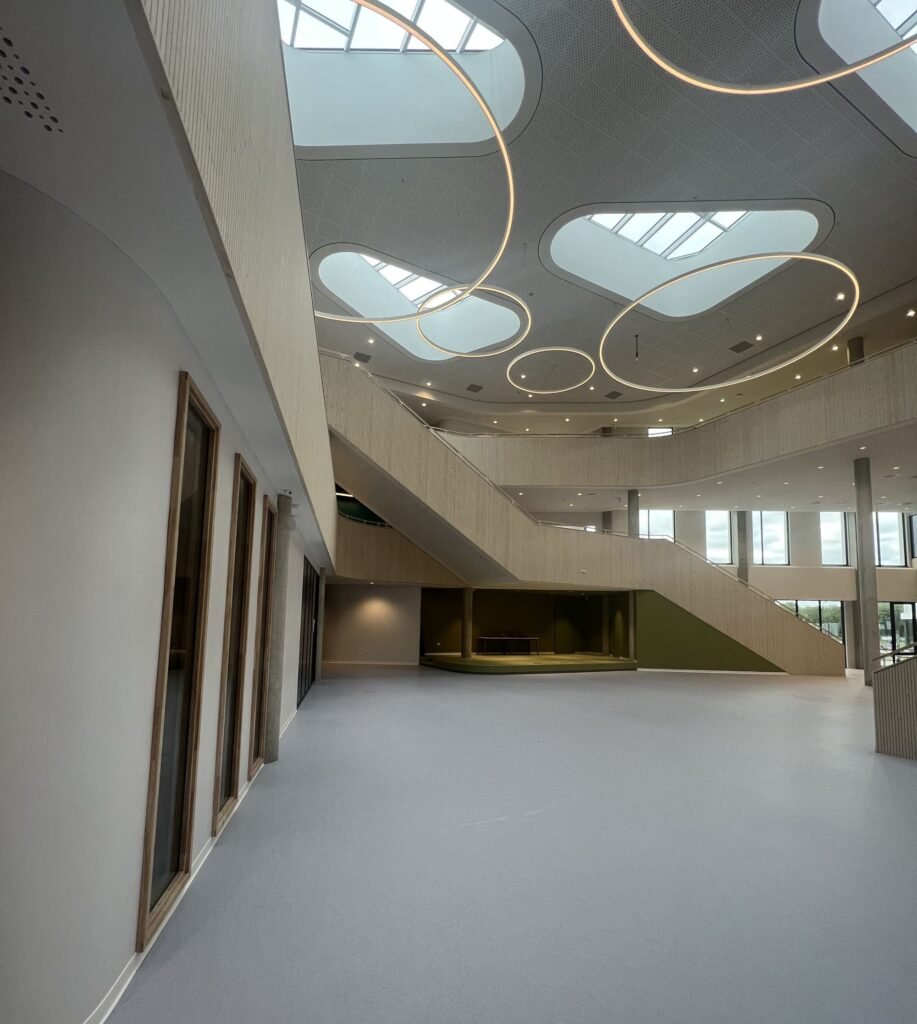 Verhoeven van Gyproc is enthousiast over het eindresultaat. “Janse Afbouw heeft mooi werk geleverd met onze producten. Het plafond met erin verwerkt de daklichten en onze Rigitone geperforeerde platen is echt een plaatje geworden, net als de vele ronde wanden die zijn toegepast.” De directeur van Janse Afbouw is trots. “We hebben heel wat grotere projecten gedaan, maar bij dit project kwamen we voor heel wat uitdagingen te staan. De detailleringen die in elkaar overlopen, de complexiteit van de maatvoeringen, de complexiteit van het geheel maken het een project dat wij met recht als showcase kunnen gebruiken. Alles paste, overal waar het rond loopt of schuin afloopt. De koven, de schenkels, de daklichten. Alles superstrak. Dat is echt kicken!”