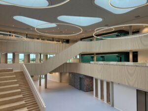 De trappen en vooral de balustrades vormden een volgende technische uitdaging voor Janse Afbouw, vertelt de directeur. “Vooral de hoogte van de koven was een dingetje. En daarnaast de overgang van het geperforeerde gips naar het standaard gips. De balustrades zijn aan één zijde op de rechte delen volledige bekleed met de 12,5 mm dikke stootvaste DuraGyp-plaat en op de ronde delen met 6 mm buigbaar gips. Dit hebben we op een Metal Stud-frame gemonteerd. De andere zijde van deze trappen en balustrades hebben we afgetimmerd met houten panelen die tevens een akoestische werking hebben. Rondom deze trappen en balustrades bevinden zich 1070 m² Gyproc Rigitone 12-20/66 met Activ’Air.”