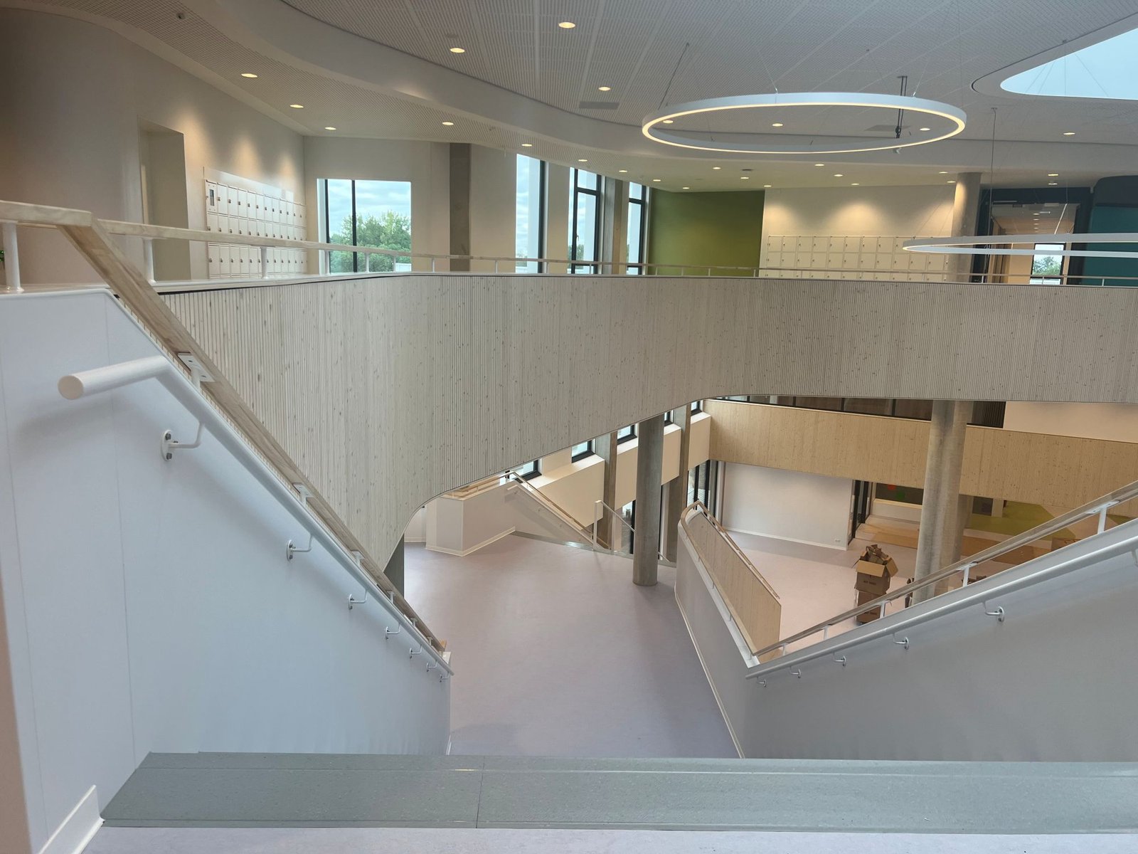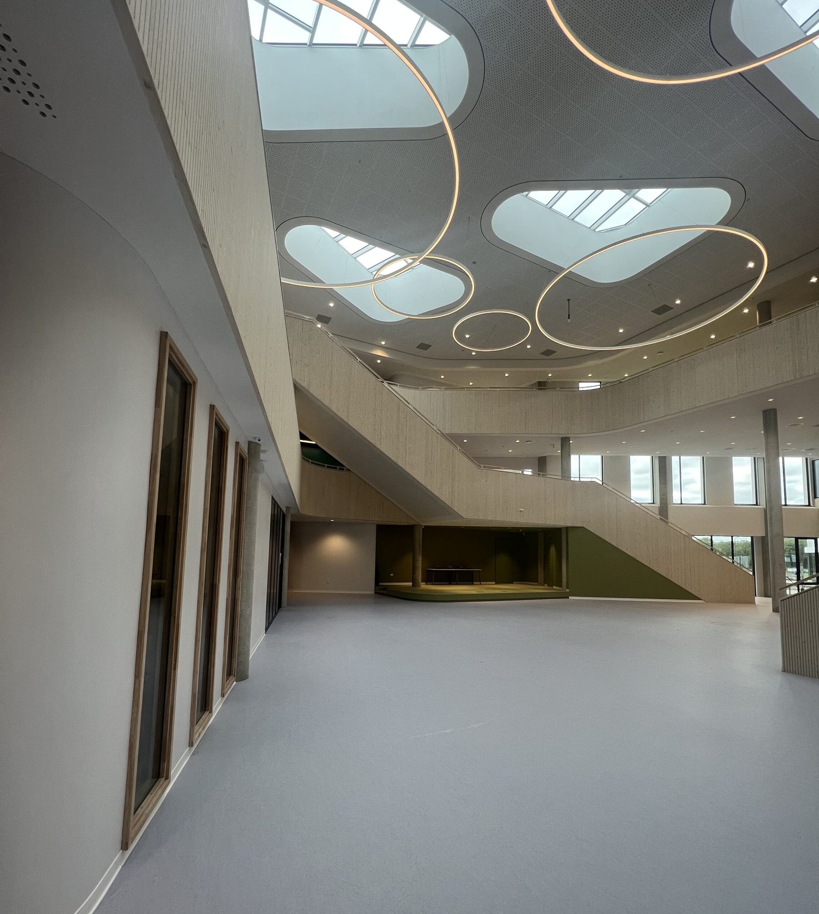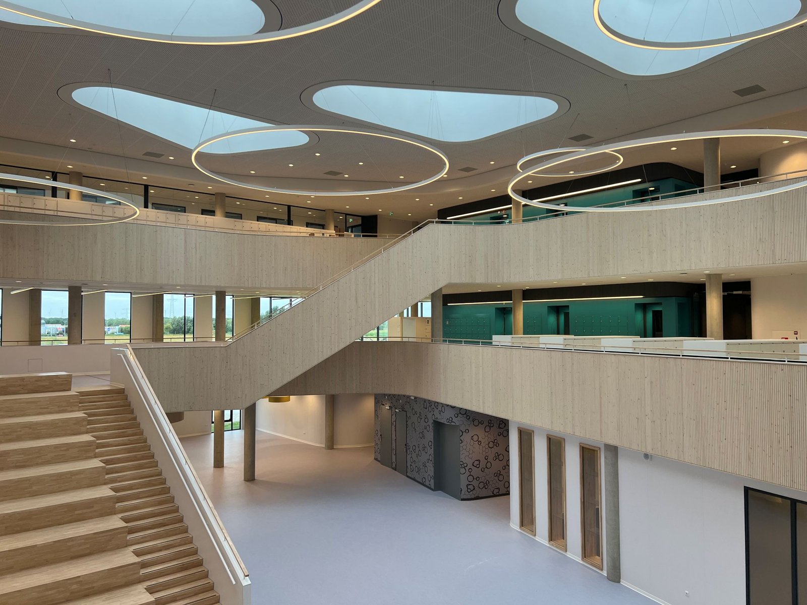 Het is pauze. Leerlingen staan voor de ingang met elkaar te kletsen. Een aantal loopt naar de verscholen fietsenstalling om naar de supermarkt in de buurt te gaan. Van buiten is niet direct duidelijk hoe het gebouw er van binnen precies uitziet. Architect Van Leeuwen vertelt: “Het gebouw bestaat uit een aantal vleugels met ieder een eigen plek voor de leerlingen. Kleinschalige en herkenbare domeinen. Rond de leerpleinen is een mix van gevarieerde onderwijsruimten geprojecteerd. De vleugels zorgen voor een overzichtelijke en ‘leesbare’ opzet van het gebouw. In het hart van het gebouw bevindt zich de centrale circulatieruimte waar de verschillende functies samenkomen. Aan deze ruimte bevinden zich een aantal pauzegebieden. Geen grote centrale aula, maar juist een aantal kleinere ruimtes verspreid door het gebouw aan de gevels met veel daglicht en zicht op groen. Leerlingen vinden hierdoor elk hun eigen plek waar zij zich thuis kunnen voelen.”