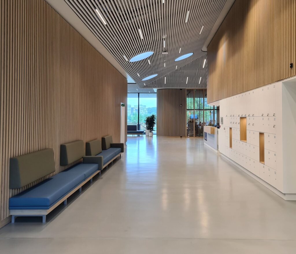 Op de campus van de Wageningen University & Research (WUR) is een bijzonder gebouw verrezen: Omnia. Dit multifunctionele gebouw ligt als een paviljoen in het groen, een plek waar studenten en onderzoekers op een toegankelijke manier de dialoog met elkaar en met de samenleving kunnen voeren. De plafonds en wanden in de gangen, de grote zalen en in het restaurant laten een fascinerend lijnenspel zien.