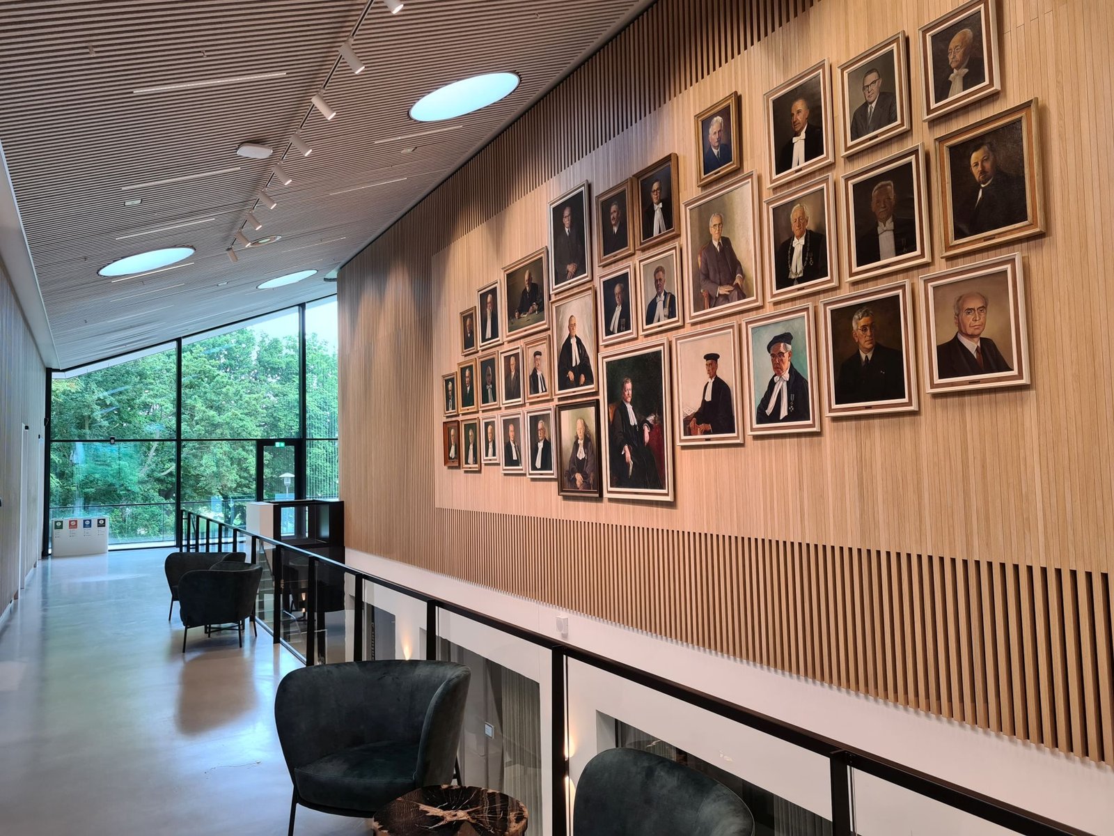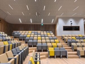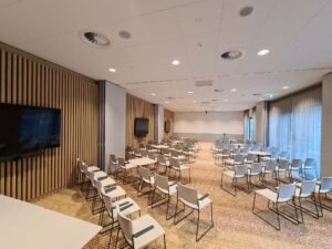 Op beganegrondniveau liggen spreekkamers annex presentatieruimtes. Deze zijn met behulp van schuifwanden qua grootte aan te passen. Profinish heeft hier de systeemplafonds gemonteerd. Van der Veen: “Het betreft Rockfon Blanka, verdekt gemonteerd. Dit hebben we ook in de zogenoemde inauguratiezaal toegepast.”