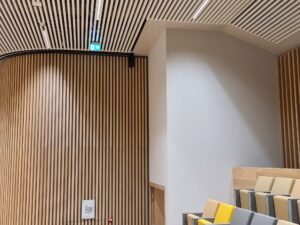 De combinatie van de aluminium lamellen en de verticale houten latten op de wand zorgt voor een fascinerend lijnenspel. “Die houten wanden zie je onder andere ook in de gangen. Die zijn prachtig gemaakt door interieurbouwer Parthos. In de grote zaal lopen ze als het ware door in het plafond. Om de aluminium lamellen in de hoeken mooi aan te laten sluiten hebben we een special bedacht. De architect had hier geen oplossing voor bedacht. Het lijnenspel van de lamellen moest doorbroken worden, omdat de aansluiting niet in 145 graden kon. Daarom hebben we hiervoor hoekkepers aangebracht door een stalen strip toe te passen. Nu loopt het perfect door”, vertelt Van der Veen trots.