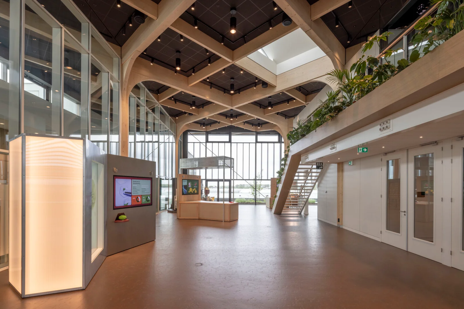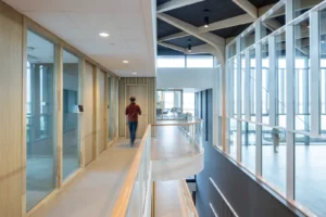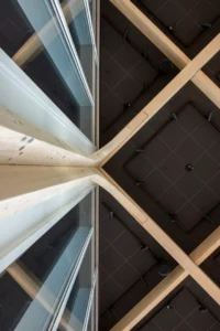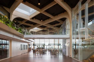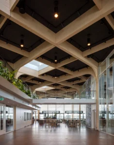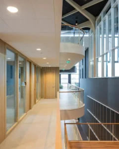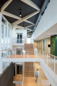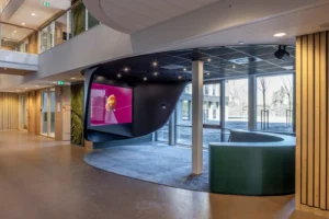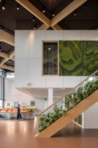 “Ik zeg dat niet vaak, maar het ontwerp van de architect is echt prachtig.” Sjaak doelt op de multifunctionele ontmoetingsruimte (MFO) in het centrale atrium. “De spanten zijn in een ruitvorm uitgevoerd en zichtbaar gebleven. In de vlakken van de ruit hebben wij de al genoemde Color-all Special panelen gemonteerd. Een echt blikvanger, ook door het contrast qua kleuren. De lichte houtkleur van de spanten, deze kleur komt ook terug in de trappen en akoestische wandbeplating – die wij overigens custom made hebben gemaakt – in combinatie met het donkergrijs van de plafondpanelen en het groen van de planten in de bakken en de mospanelen, die wij overigens niet hebben gemaakt. Het is echt een plaatje om te zien”, vertelt hij enthousiast.