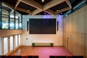 Het kleurencontrast komt sterker terug in het auditorium, vervolgt de projectleider zijn verhaal. “De tribunes met zittingen die in verschillende kleuren rood zijn uitgevoerd, van licht tot echt donkerrood, met de prachtige, hoge akoestische wand in een lichte houtkleur en het donkergrijze plafond. De wand is zeven meter hoog, hierin is onze expertise echt tot uiting gekomen. Dat is echt maatwerk”, legt hij uit.