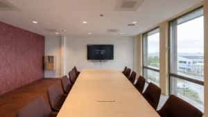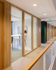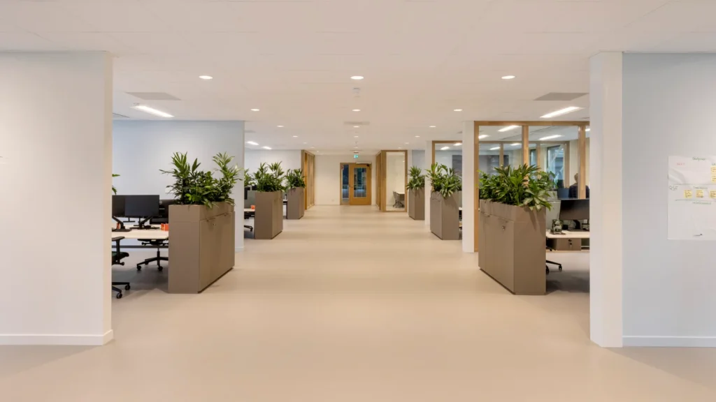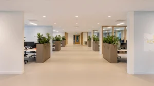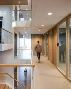 Het andere kleurgebruik is rustig gehouden, er is veel wit toegepast. Sjaak: “De overheersende kleur van de plafonds in de gangen en de kantoren is wit. Hier hebben we Rockfon Pallas wit in de afmetingen 60 x 60 en 60 x 120 gemonteerd. Het wit komt ook terug in de akoestische wandpanelen met microperforatie aan de ene buitenzijde van het kantorenblok, aan de andere kant zijn lichtgrijze akoestische panelen met microperforatie gemonteerd.”