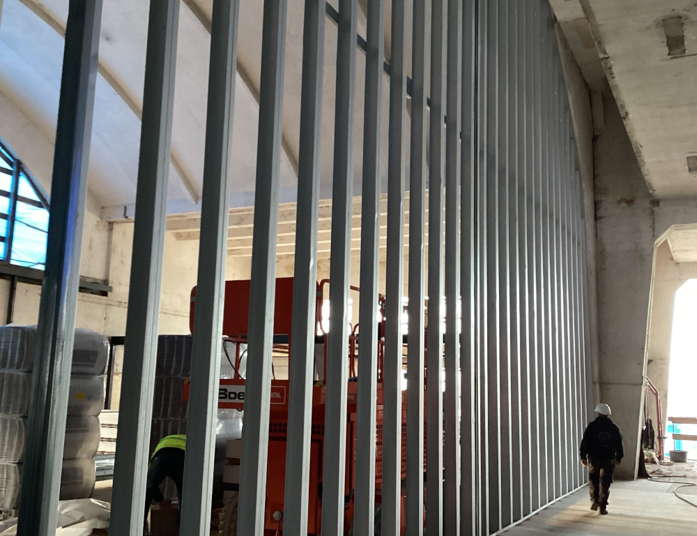 Waar ATR Projectafbouw wel aan mee heeft gewerkt, is de montage van de hoge wanden in de derde fase. Voor het bedrijf uit Amersfoort een primeur, vertelt Van Esveld. “We hebben eerst wanden van 7 tot 8 meter meter hoog gemonteerd. Dat hadden we al wel eens gedaan, maar niet met de Diamond Board-platen van Knauf. Die zijn even wat zwaarder dan standaard gipsplaten. Maar we hebben ook wanden van maar liefst 11,4 meter hoog gemonteerd met de zware Diamond Board-platen. Dat was van een andere orde. Pas als je op de hoogwerker staat. Kom je erachter hoe hoog dat is. Dat komen wij zeker niet vaak tegen en dat hadden we zelf nog niet gedaan. Dan heb je het over beplating zonder onderbreking van bijvoorbeeld stalen liggers. En de platen moesten ook meelopen met een ronde toog. Dat vereist een andere werkwijze. Hier hebben we advies over aangevraagd bij Knauf.”