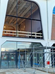 De aannemer had de oude pui van het pand verwijderd. Werken met een hoogwerker op grote hoogte met windbelasting van twee kanten, was niet aan te raden. Van Esveld: “De aannemer reageerde daar adequaat op. Er werden – ook op aangeven van Knauf – planken en zeilen voor de openingen aangebracht. Redelijk toereikend om een windje tegen te houden, maar ik ben blij dat we de laatste tijd aangename temperaturen hebben gehad. Want het blijft natuurlijk een tochtgat om in te werken.”