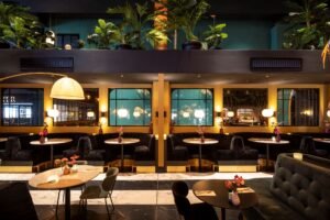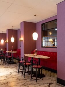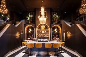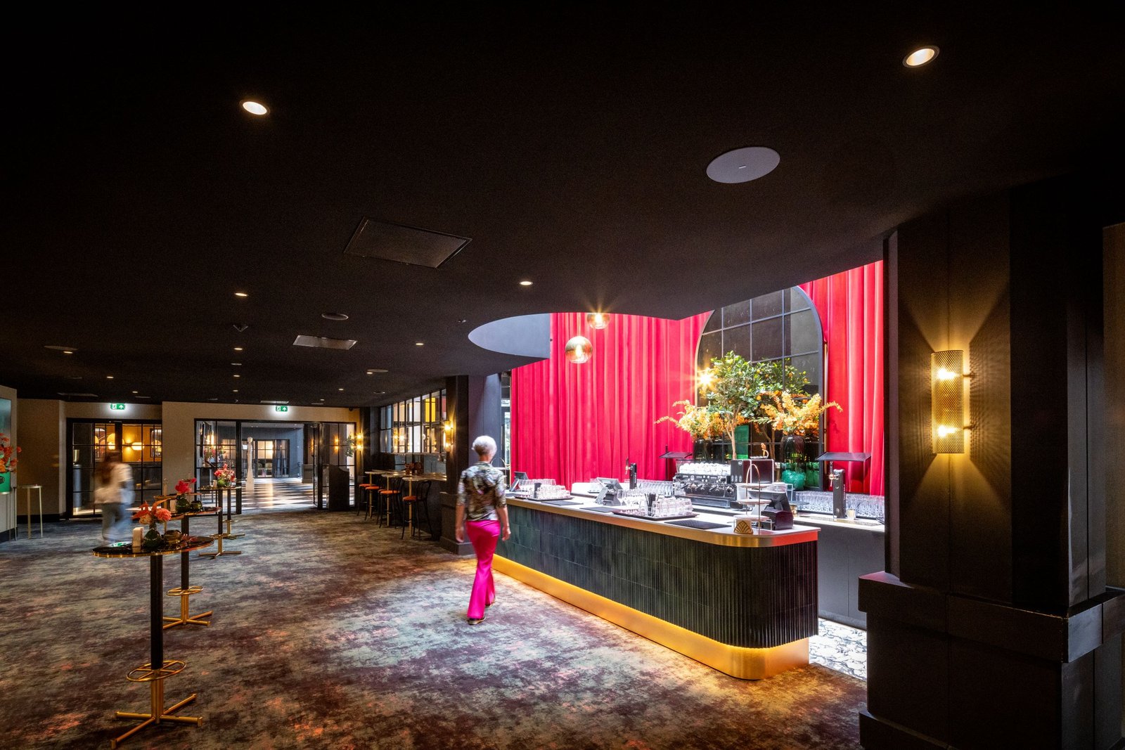 In de serre zit een aantal mensen in een bleek zonnetje achter het glas een kop koffie te drinken. Bij binnenkomst wordt de bezoeker al een glimp gegund van het Cerise Grandcafé, een ruimte die grandeur uitstraalt. Zwart-witte marmeren vloer, gouden kroonluchters aan een zwart plafond, zwarte trappen en een zeven meter hoge groene wand als afsluiting van het theaterdeel. Aan de overzijde van die groene wand straalt licht in een volgende ruimte. Hier worden de laatste etenswaren van het ontbijtbuffet opgeruimd. Ook hier een prachtige marmeren vloer en gouden accenten, deze keer in combinatie met crème-witte elementen en een crèmekleurig plafond. Terug in het Cerise Grandcafé lopen links en rechts van de bar een trap naar de videverdieping. Hier voert ook zwart de boventoon. Zie hier een deel van het resultaat van de ingrijpende renovatie die het Van der Valk TheaterHotel De Oranjerie in Roermond heeft ondergaan.