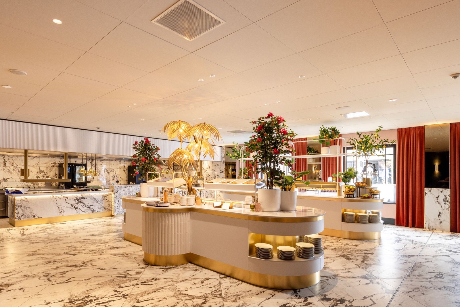 De ontbijtzaal heeft een totaal andere sfeer, gecreëerd door een ander kleurgebruik. Hier overheersen crème, wit en goud. “Het plafond bestaat uit Rockfon Color-all panelen in de kleur Hemp. In de keuken hebben we Rockfon CleanSpace Pro gemonteerd”, vertelt Houtvast.