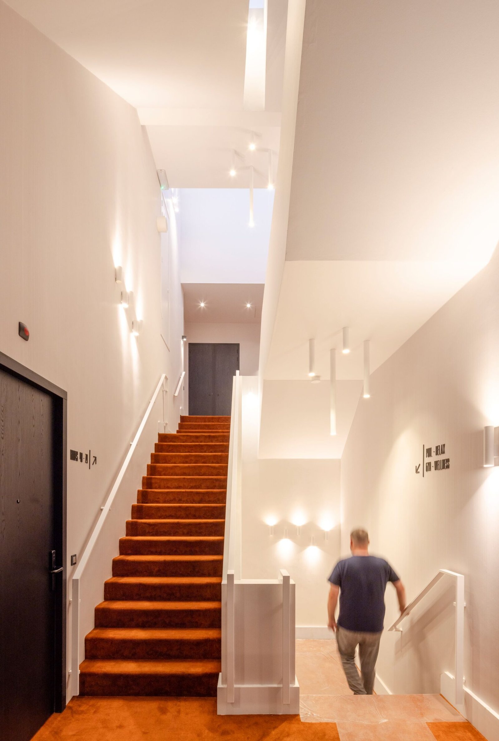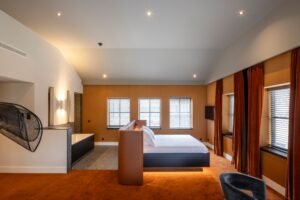 In het voormalig KPN-gebouw zijn 44 kamers over drie bouwlagen gerealiseerd. De kamers hebben veelal verschillende plattegronden. Die diversiteit heeft te maken met de bepalende vorm van de plattegronden en de doorsnede van het gebouw, zegt de projectleider. “Het pand heeft namelijk een duidelijke betonnen structuur die we wilden behouden. Dat maakt dat er meerdere type kamers zijn ontstaan, elk met een eigen invulling, die op een heldere wijze de structuur volgen.” Een rondleiding door het nieuwe boutiquehotel laat een aantal verschillende type kamers zien. Pièce de résistance is de suite op de bovenste verdieping. Tegenover het kingsize bed is de badkuip opgesteld, achter de wand is een grote inloopdouche en een sauna.