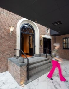 Lopend door de verbindingsgang komen gasten aan bij de ingang van de voormalige telefooncentrale, die volledig in oorspronkelijke staat behouden is gebleven. “Het pand heeft een historisch karakter en is beschermd stadsgezicht. Dat leverde voor ons enkele beperkingen op. We hebben ervoor gezorgd dat alle buitenkozijnen zijn vervangen naar hun originele vorm en indeling. De enige wijziging die we mochten aanbrengen, was om daglichttoetreding op de hotelkamers te creëren. Dit hebben we gedaan door op de tweede verdieping elke hotelkamer te voorzien van een grote dakkapel. Hiermee is ook de bewegingsruimte rondom het tweepersoonsbed in de kamers op die verdieping te optimaliseren”, legt Karis uit.
