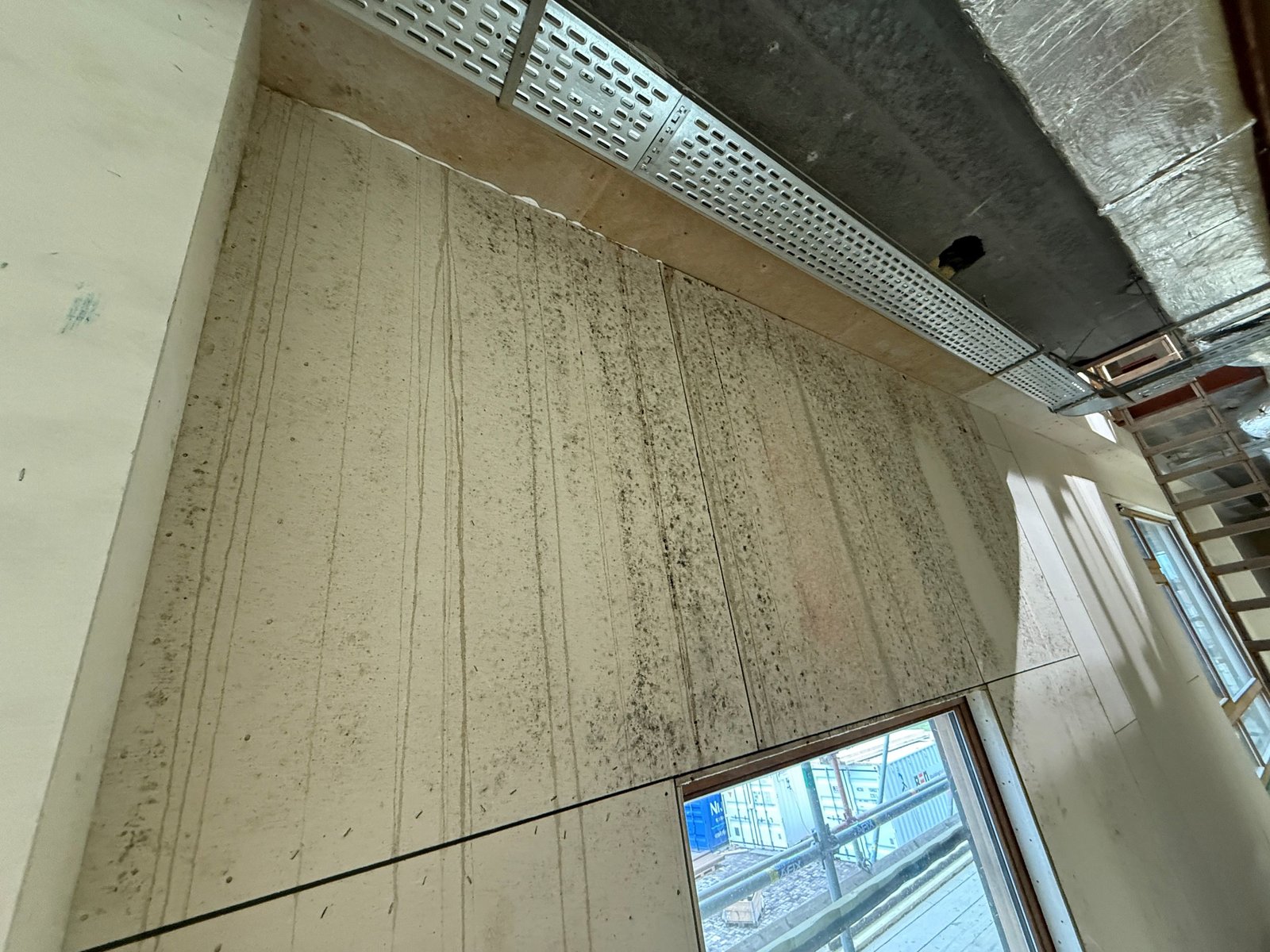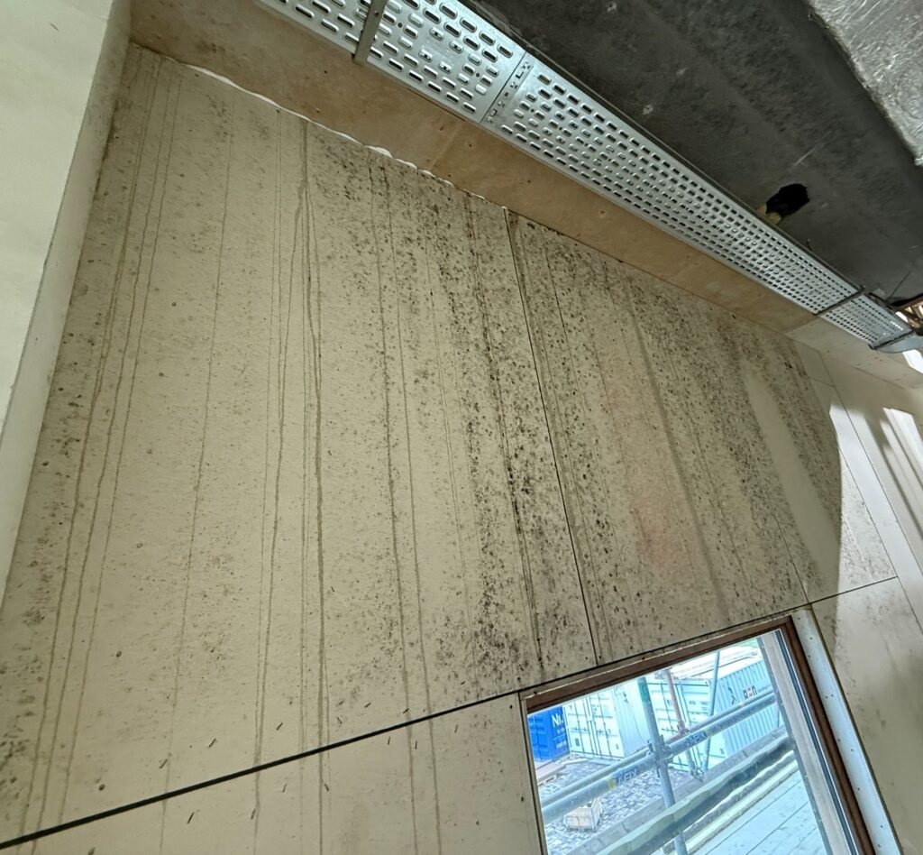 Bij een project worden door het afbouwbedrijf gipskartonnen wanden gemonteerd. Daarna worden de naden gevoegd en gefinisht. Het afbouwbedrijf maakt zich zorgen over wat de gevolgen kunnen zijn van de enorm vochtige omstandigheden op de bouwplaats. Enkele gipskartonwanden zijn namelijk al aan het opbollen. Het bedrijf vraagt TBA om een tussentijdse kwaliteitsbewaking uit te voeren. Volgens de Richtlijn plafond en wand 3.3 moet tijdens het monteren van de gipsplaten de temperatuur minimaal 7 ̊°C zijn en de relatieve luchtvochtigheid (RV) moet tussen 40 en 80 procent liggen. Voor het afvoegen gelden andere eisen. De natte werkzaamheden – het aanbrengen van stukadoorswerk en dekvloeren, die voor een stijging van de relatieve luchtvochtigheid zorgen – moeten zijn uitgevoerd voordat de wanden en de plafonds worden afgevoegd. De meest ideale situatie is als de temperatuur en de relatieve luchtvochtigheid gelijk zijn aan de omstandigheden zoals deze tijdens het gebruik van het gebouw gelden; een temperatuur van 20 °C en een RV tussen 50 en 65 procent. De temperatuur moet volgens de richtlijn minimaal boven de 10 °C zijn en de RV moet tussen 40 en 65 procent liggen. Bij het genoemde project bedraagt de temperatuur tijdens de controle 9,6 °C, de RV is 83,4 procent. Door oppervlaktecondensatie zijn de gipskartonplaten volledig vochtig. Er zijn anhydrietvloeren aangebracht die nog steeds vochtig zijn. Er wordt niet gestookt en niet geventileerd in het gebouw. Het vocht kan dus niet weg en trekt dus in de wanden. Door het vocht zijn meerdere wanden bol gaan staan, deze bollingen zullen niet meer vlaktrekken. Het advies van TBA na de kwaliteitscontrole luidt als volgt: stop met de montage van de gipskartonplaten scheidingswanden. De ruimtes moeten eerst rustig op temperatuur worden gebracht – maximaal 3 °C per 24 uur – waarna rustig geventileerd kan worden. Een snelle temperatuurstijging zal namelijk tot snelle krimp leiden, met mogelijk scheurvorming als gevolg.