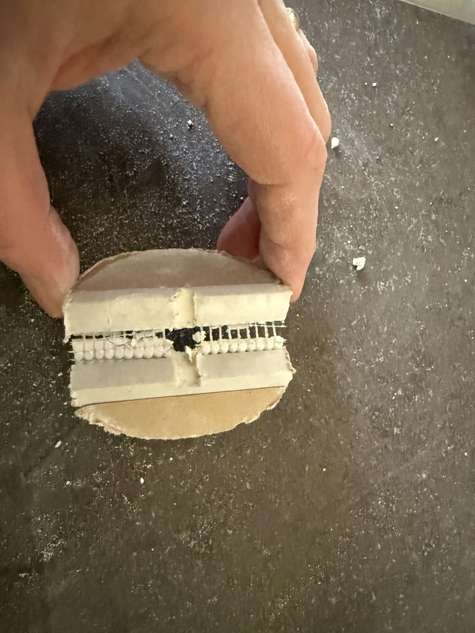 Een afbouwbedrijf heeft in een appartementencomplex gipskartonplaten plafonds geplaatst. De naden zijn volgens Klasse D afgewerkt. Daarna zijn de plafonds voorzien van spackspuitwerk. Enkele weken later ontstaat in enkele appartementen scheurvorming in het plafond. TBA krijgt de vraag wat hiervan de oorzaak kan zijn. Tijdens een controle worden inderdaad scheuren in enkele plafonds geconstateerd. Deze bevinden zich allemaal ter plekke van een langsnaad van de gipsplaten. Met een boormachine worden in twee plafonds gaten gezaagd. De boorkernen laten zien dat in beide gevallen gaasband als wapeningsband is toegepast. Dit is echter al sinds 2021 niet meer toegestaan voor de afwerking van gipsplaten op plafonds. De scheuren zijn het gevolg van krimpspanningen in het plafondvlak. Deze spanningen zijn op te vangen door de juiste producten toe te passen. Gaasband is te zwak om deze spanningen op te vangen. Daarom is TBA Richtlijn 3.3 in 2021 aangepast. In de aangepaste versie staat dat gaasband op plafonds niet meer is toegestaan als wapeningsband. De toegestane producten zijn papierband of glasvliesstroken. Bij de montage zijn dus de verkeerde producten toegepast. Na het constateren van de scheuren zijn de plaatnaden opengezaagd, de ondergrond geprimerd en opnieuw gevoegd met papierband.
