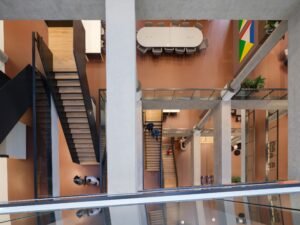 Vanuit het station werden postzakken aan de voorkant het gebouw binnen gebracht naar de enorme sorteermachines. Dat waren beelden in het verleden. Nu is er door de transformatie van het Stationspostgebouw in Den Haag door KCAP en Kraaijvanger Architects een atrium ingericht, omringd door cascadevormige vloeren, dat wordt doorkruist door bruggen en trappen. Het heeft wel iets weg van de transportbanden en sorteermachines waarmee de poststukken vroeger direct vanuit het station werden aangevoerd. Waar de post werd gesorteerd, is nu het Community Centre ingericht. Hier is de ontvangstbalie, zijn de gezamenlijke ruimtes te vinden, ontmoetingszones en werkplekken. In het cafégedeelte zitten nu medewerkers van PostNL te lunchen. Na de transformatie heeft PostNL het grootste deel van het gebouw betrokken als nieuw hoofdkantoor. Foto’s in een gang laten de historie en het gebruik van het gebouw zien.