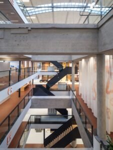 Het deel wat wel goed in het zicht is, zijn de videranden. Deze heeft Verwol met Rockfon VertiQ akoestische wandpanelen bekleed. De montage was volgens Booij opvallend te noemen. “We hebben de panelen aan de videranden en de trapopgang kunnen monteren voordat de trap was geplaatst. Dat maakte het voor ons uiteraard heel wat eenvoudiger”, legt hij uit.